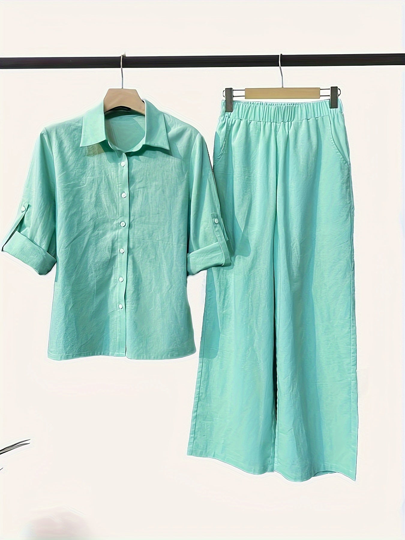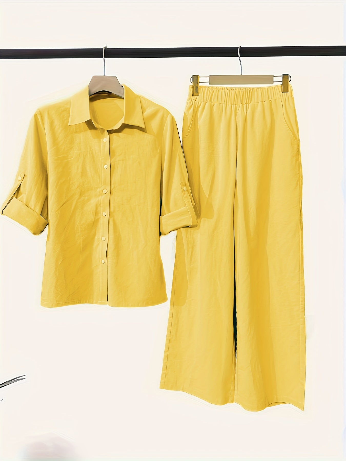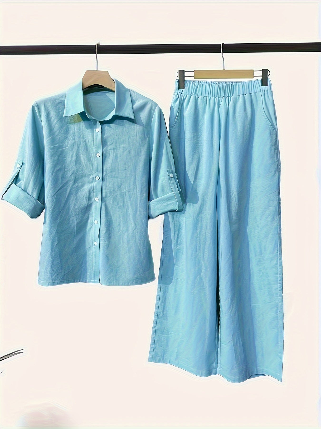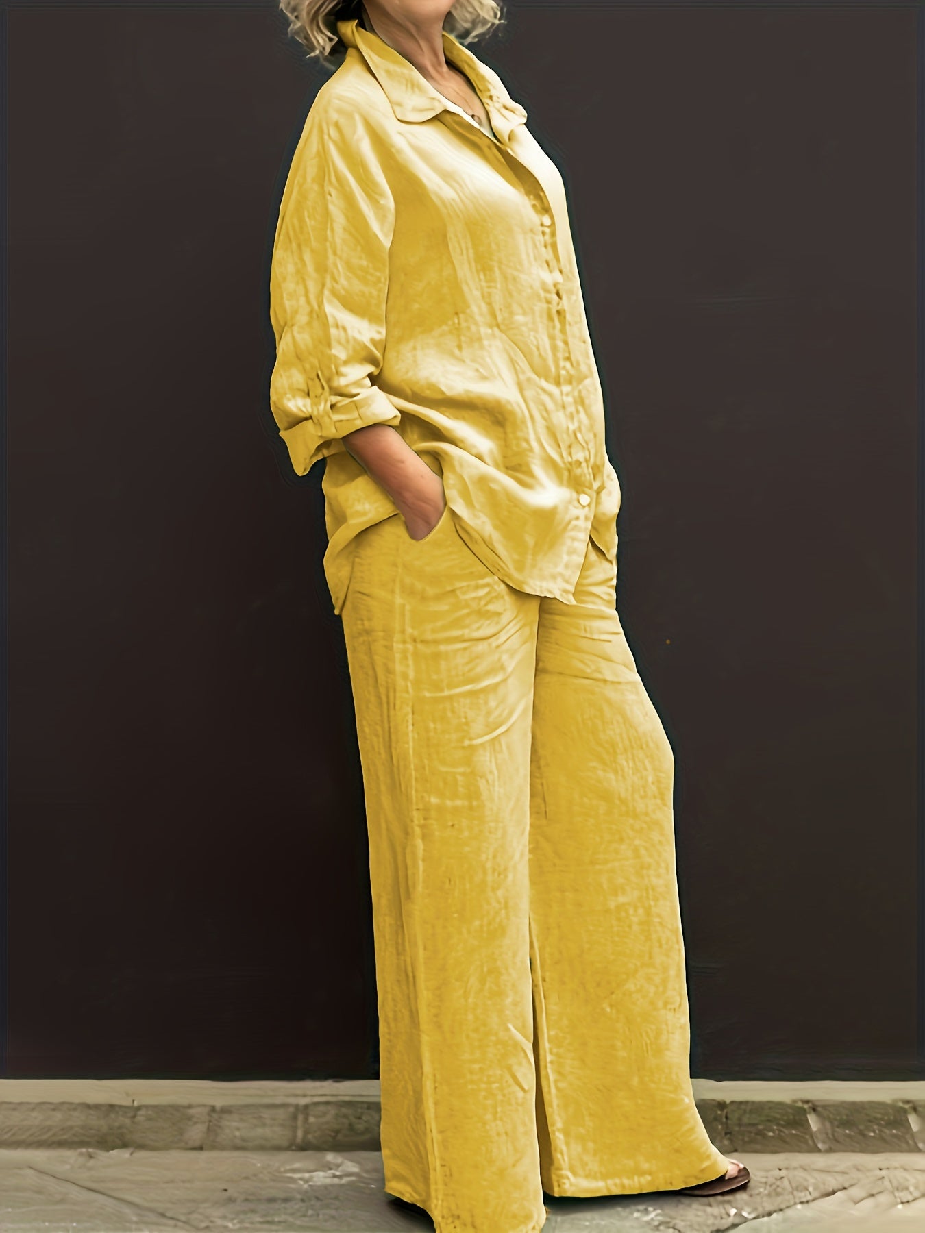 Two-Piece Solid Color Chic Pantsuit Set – Women’s Casual Long Sleeve Shirt & Elastic Waist Pants Outfits with Comfortable Fabric and Versatile Style for Daily Wear